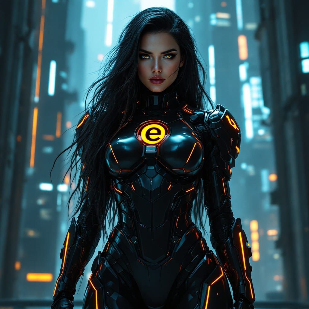 This striking sci-fi portrait captures a confident, raven-haired woman in a high-tech exosuit, adorned with a vibrant orange emblem, standing strong against a dramatic city backdrop of cyan and amber lighting.