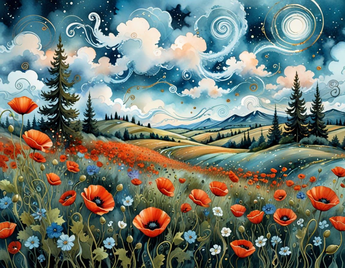 nacre and ruby dominant, (sparkles:1.3), (lignes of flowing metallic liquid copper:1.4), (spirals and swirls in the clouds:1.5), digital art, watercolor, ink painting, splash art, photo paper, whimsical, cute detailed, very detailed, intricately detailed, 3D
