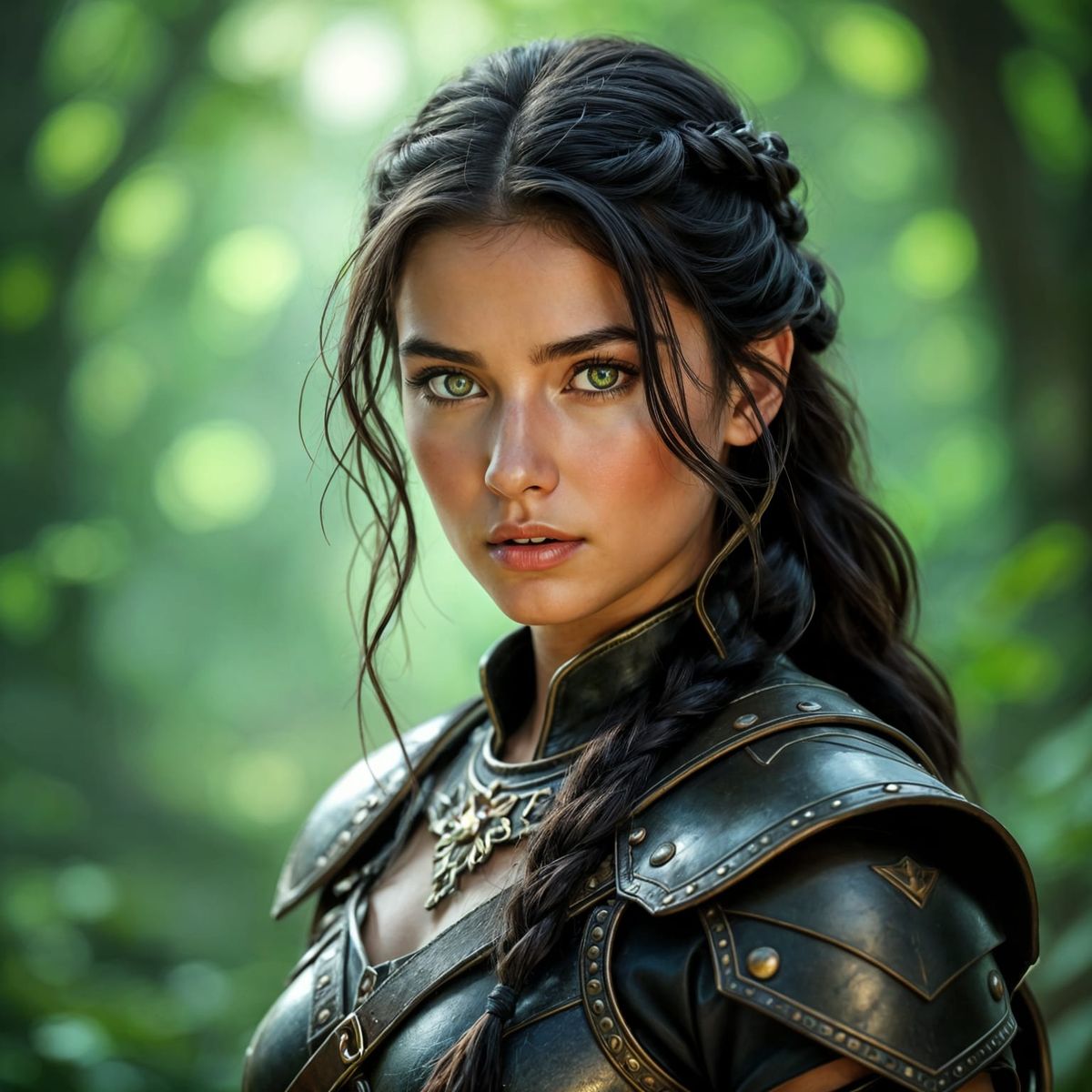 This image showcases a young warrior princess with black hair and green eyes, dressed in leather armor, set against a detailed forest backdrop. It's a photorealistic depiction.