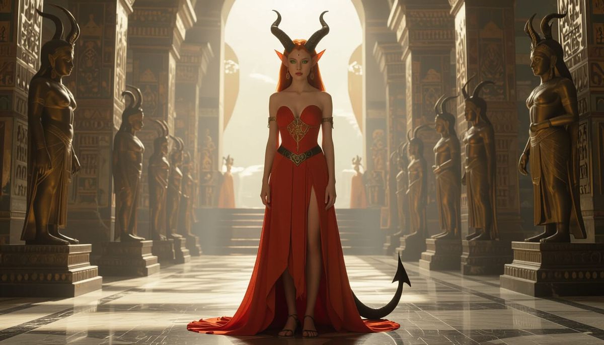 A striking image of Lilis, a middle-aged woman with striking orange skin, horns, hooves, and wings, standing in her grand temple. Cinematic film still quality.
