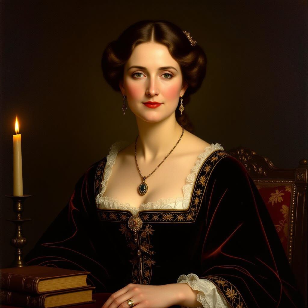 Vittoria Colonna veille sur les mots comme sur des trĂ©sors dâĂąme. Ses yeux, pleins de sagesse et de feu, semblent lire lâinvisible entre les lignes, tandis que son port noble et son Ă©lĂ©gance silencieuse font dâelle une lĂ©gende vivante, une muse intemporelle.