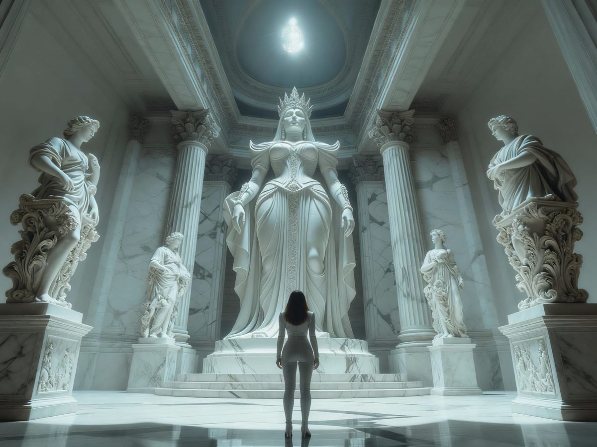 A lone explorer in a futuristic suit gazes up at a colossal, decaying marble statue of a queen. This cinematic image evokes a sense of awe and decay, rendered with dramatic lighting and film grain.