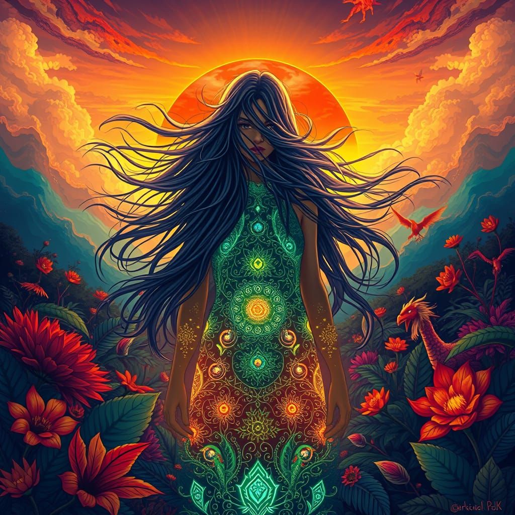 A mystical woman stands at the center of a vibrant, stormy sunset, surrounded by lush patterns, mythical creatures, and a fantasy plant kingdom, with bold colors and soft light, as she reveals intricate details and emits an aura, inviting self-discovery and authenticity.