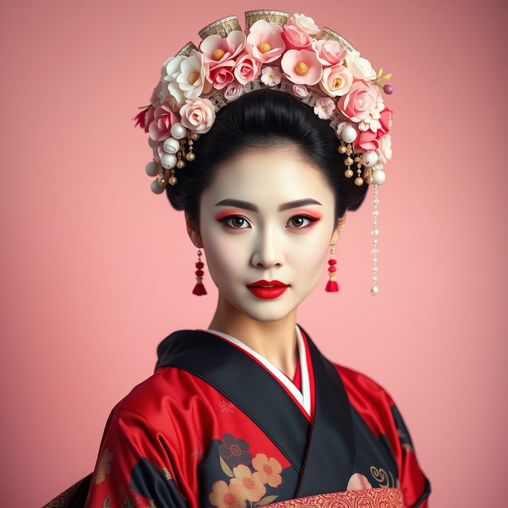A photorealistic, 4K, head-and-shoulders studio portrait of a beautiful Asian woman dressed as a geisha. She wears an ornate red and black kimono and an elaborate, traditional headdress with floral ornaments. Her makeup is classic white geisha style with bold red lips, and she is looking directly into the camera against a soft, pastel-colored background.