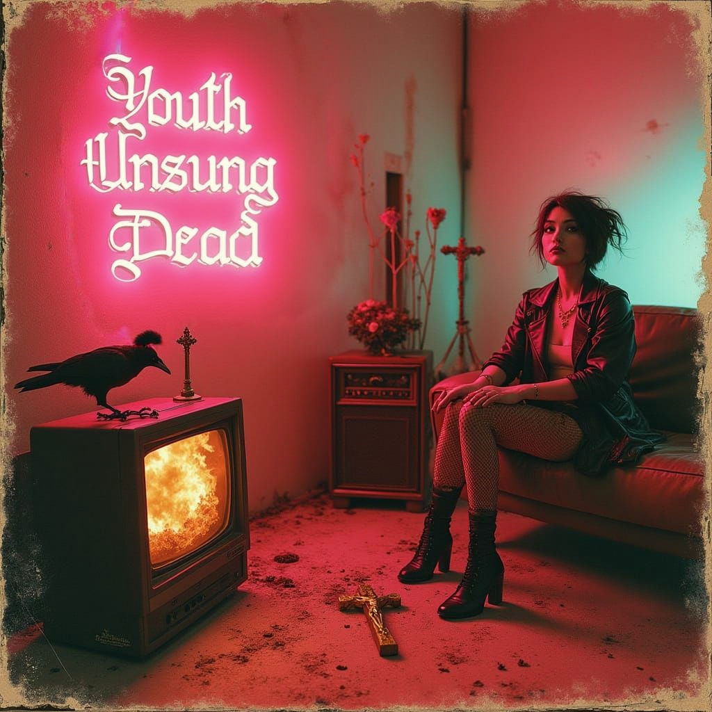 "🎵 Album Title: Youth Eternal Artist: The Unsung Dead Genre: Glam Punk / Queer Grunge / Post-Apocalyptic Rock Vibe: Blood-streaked eyeliner, a cigarette still burning in the ashtray, desert neon bleeding into dusk. The sound of resurrection on vinyl. 🎧 Tracklist Glory Rot Cigarette Halo Knife Ballet The Chapel Burned Down (So We Prayed in the Pit) Postcards from the Wreckage Lipstick in the Apocalypse Blessed Are the Freaks Crossdressed in Static Motel Youth Funeral Song for the Living Dead Boys Don’t Age Youth Eternal (Outro) 🖋️ Liner Notes / Description (NightCafe prompt-ready) A worn, vintage vinyl cover smeared with ash, faded lipstick prints, and typewritten liner notes in blood-red ink. The backdrop is a crumbling motel room glowing with pink neon and static from a broken TV. The album’s mood is grunge and glitter, desert trash elegance, echoing queer rage and sorrow. There’s a gold crucifix on the floor, cracked open like a locket. A crow perches on an amp. Torn fishnets and leather jackets. A cassette player burns softly in a sandstorm. This is Presley Kingston’s scream against time, memory, and god. Visual motifs for NightCafe tags: Glam punk aesthetic 2000s grunge revival Desert motel at night Neon crucifix, broken television Queer gothic fashion Blood and gold color palette Sonic Youth album art style Handwritten tracklist on torn paper Crows, static, glitter, decay"