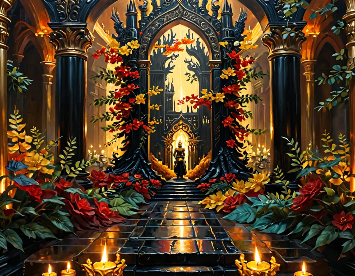 A striking picture of a warrior queen on her throne in a palace. The scene is a vibrant oil painting with triadic colors. Golden light reflects off her black metal armor and ornate gold ornaments.