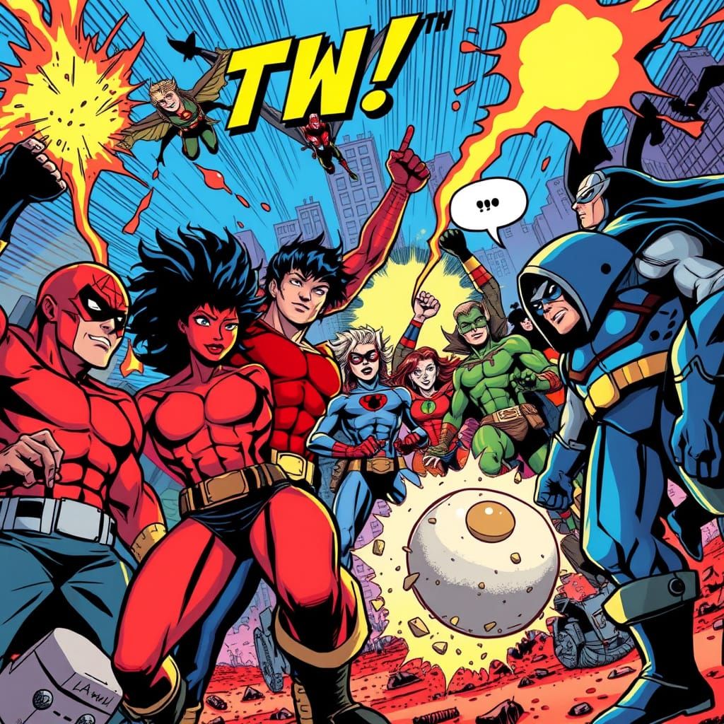 This image showcases a vibrant comic book scene with dynamic characters and bold lines, blending digital painting and cel-shaded textures in a striking visual style.
