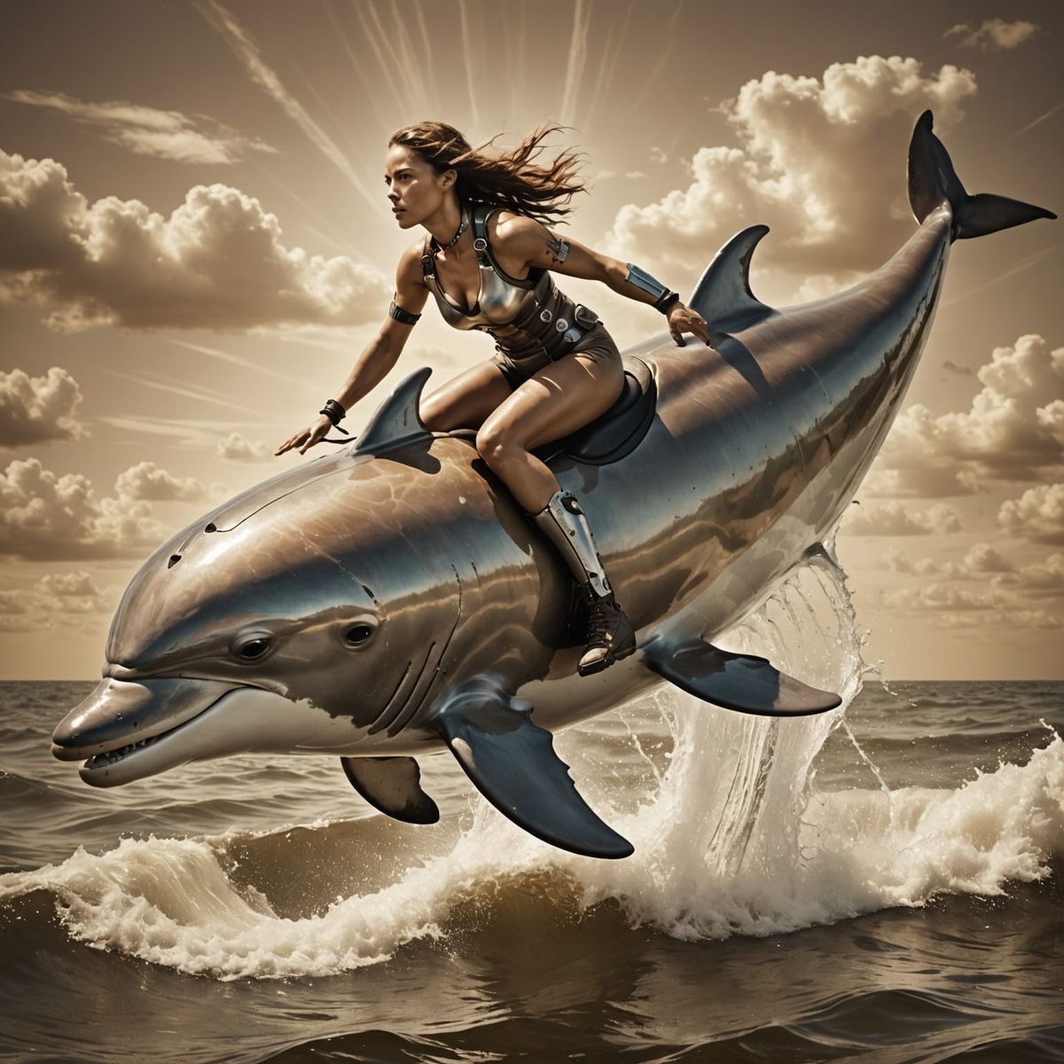 Easily generate your own cyborg woman riding a dolphin images for free with our flexible AI tool.