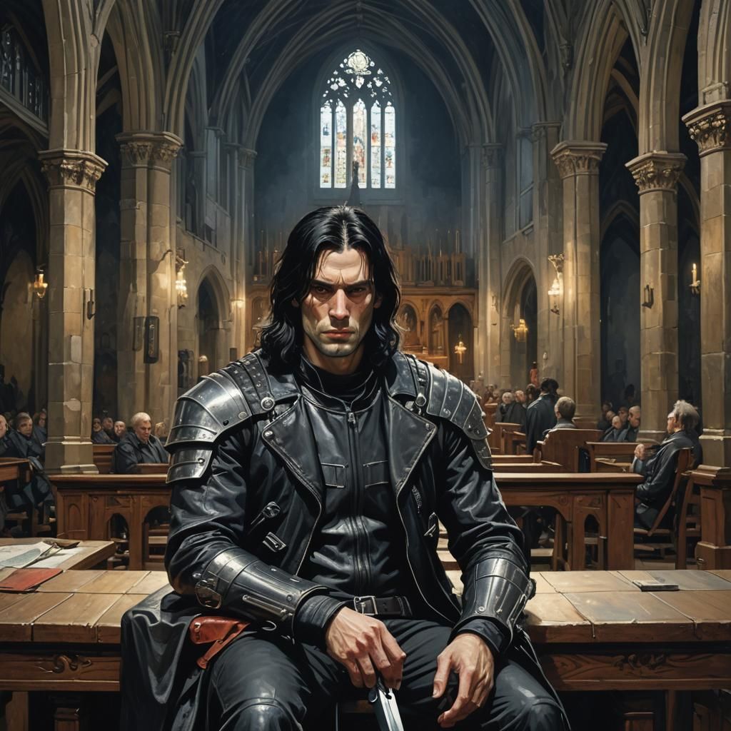 A Sabbat paladin waits patiently in a church, ready to take up his sword in the name of his fell cause.