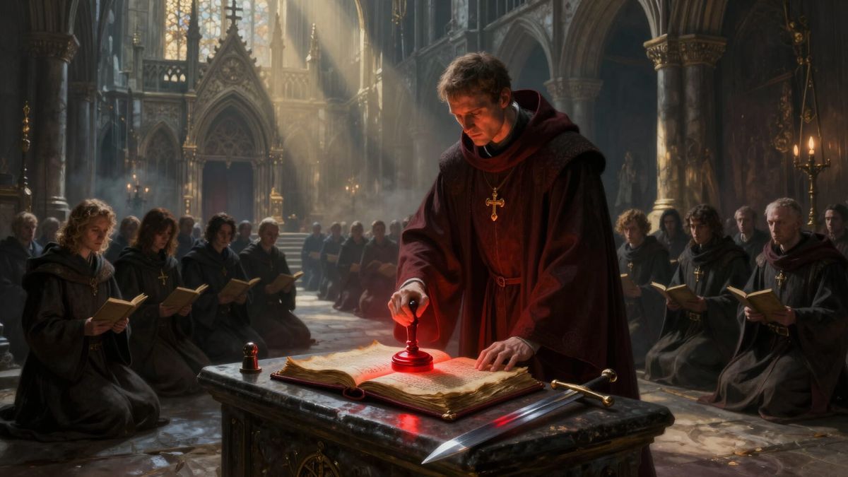 This image depicts a hyper-realistic, cinematic medieval scene of a high cleric pressing a glowing crimson seal onto a manuscript in a dark stone chamber. It features dramatic lighting and oppressive shadows.