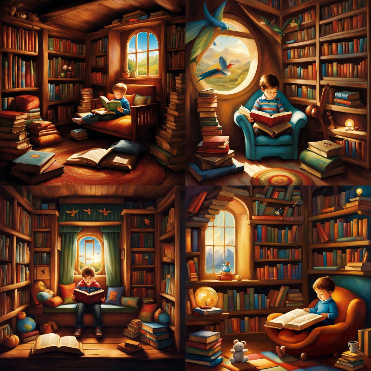This image shows a child engrossed in reading in a cozy nook. The scene is filled with literary symbols like floating books and quill pens, celebrating the joy of reading.
