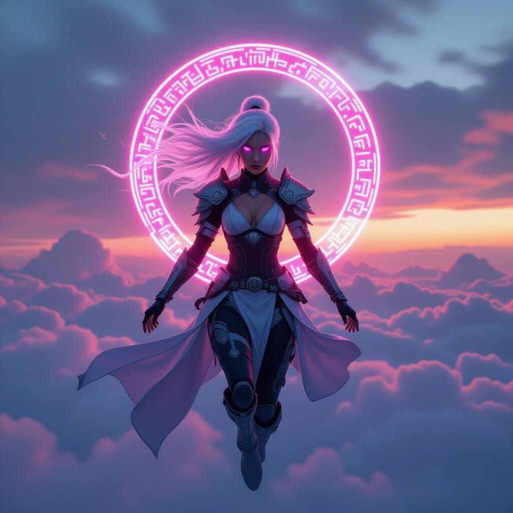 A striking picture of a futuristic female warrior suspended in the air. The figure has glowing skin, silver hair, and a halo of shifting glyphs, rendered with soft lighting in a cyberpunk aesthetic.