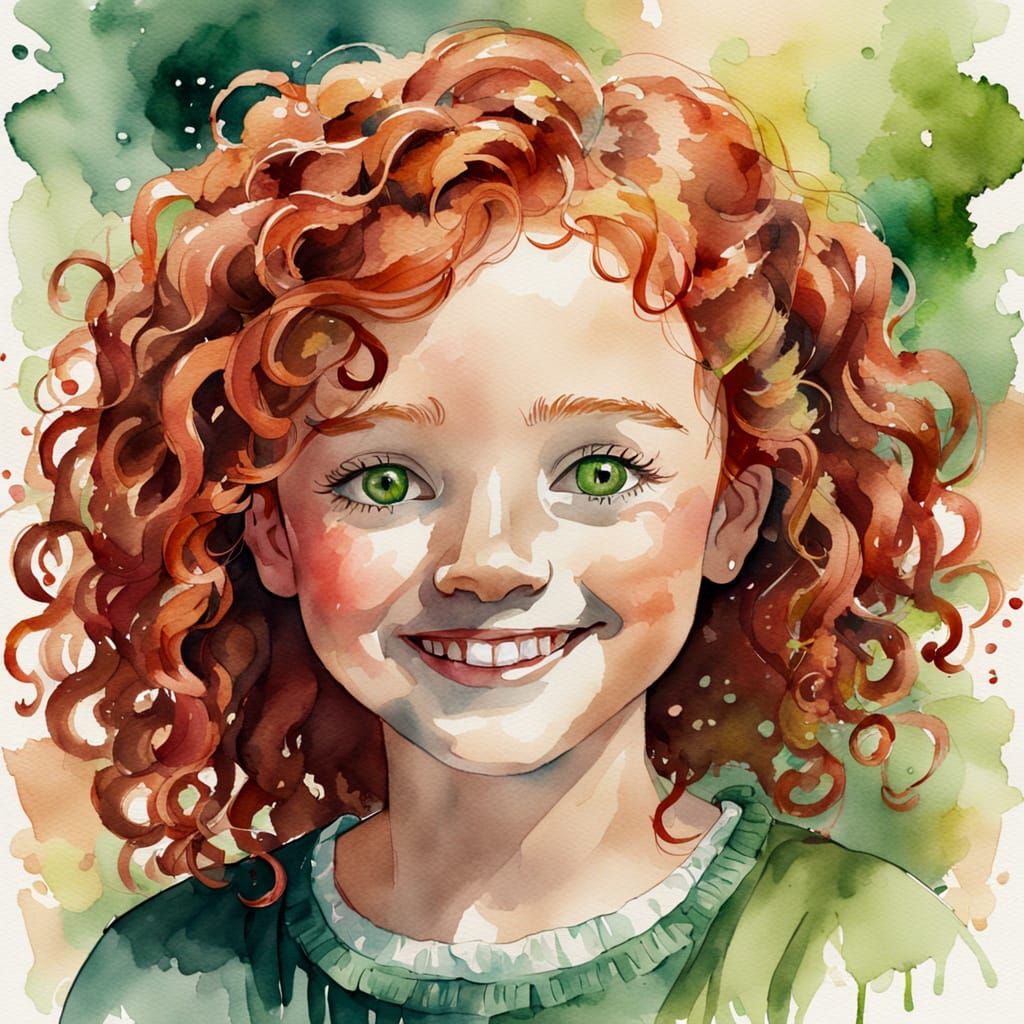 This charming watercolor portrait features a smiling young girl with vibrant green eyes and curly red hair, set against a soft, blended background with loose brushstrokes and delicate texture, evoking a sense of whimsy and wonder.