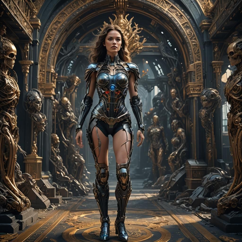 A digital painting of a beautiful, slender woman. The artwork shows a maximalist aesthetic, with meticulous details and dramatic lighting, reminiscent of a cinematic scene.