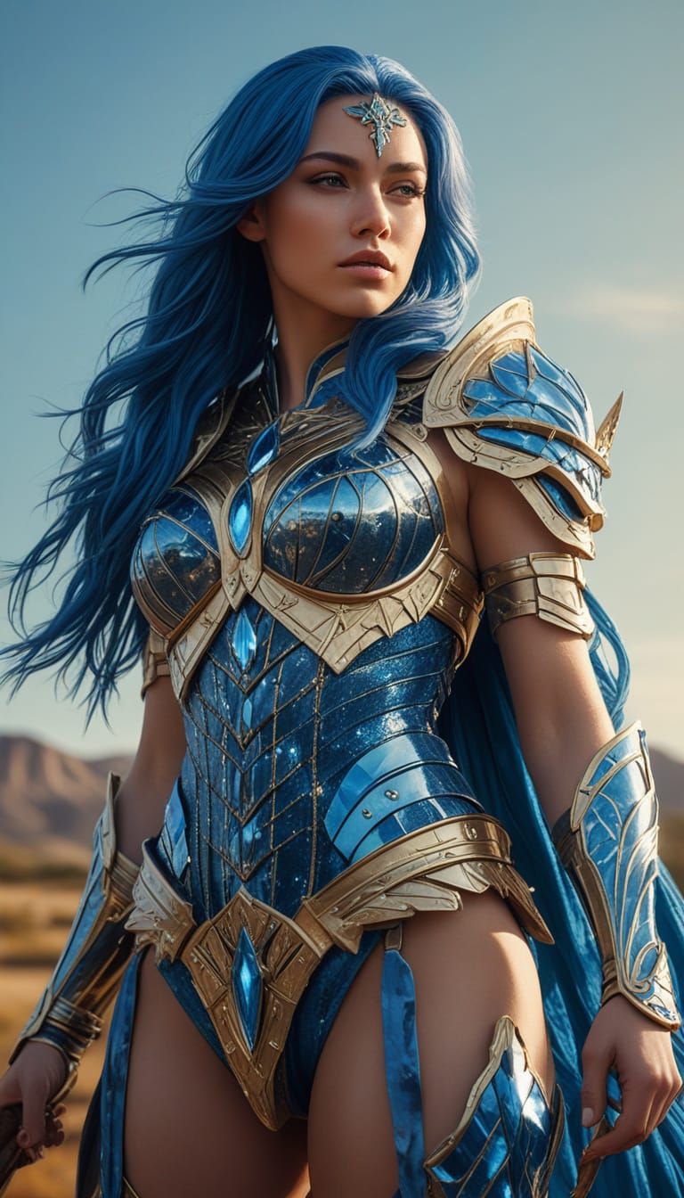 This image shows a female warrior in crystalline armor with flowing blue hair, holding a glowing spear. Iridescent crystals shimmer under soft, warm cinematic lighting, creating a dramatic and epic scene.