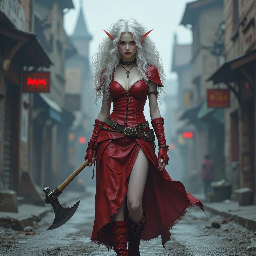 A striking image of an albino elf maiden with silver hair, holding a hatchet, in a red leather outfit within a deserted, wicked city. Rendered in a maximalist digital matte painting style.