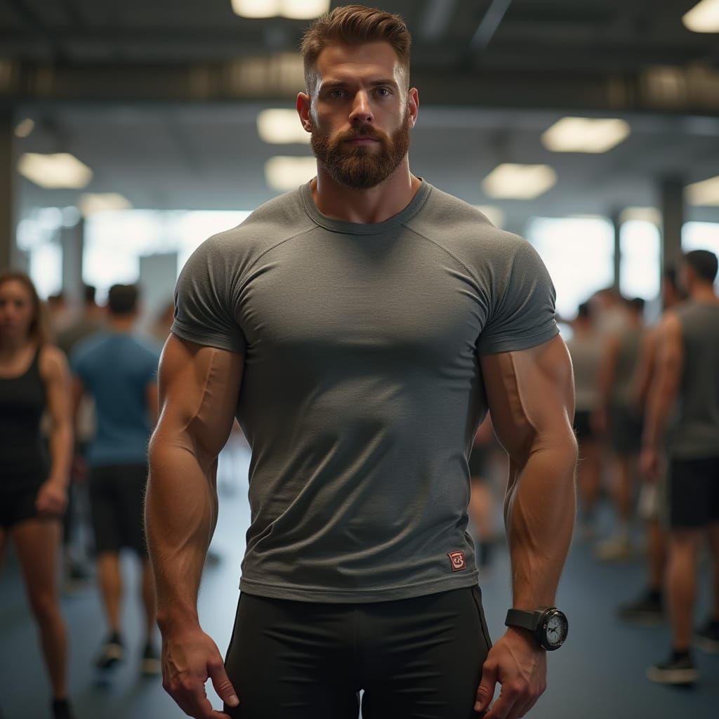 A hyper-realistic depiction of a fit individual in a bustling gym, showcasing precise textures and lighting, with a focus on realistic detail.