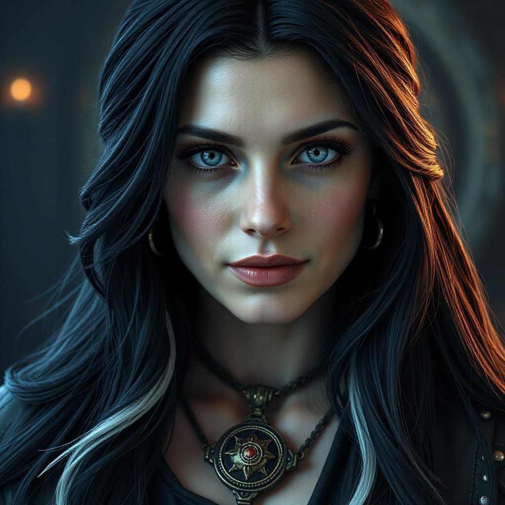 This striking concept art features a 40-year-old sorceress resembling Hedy Lamarr, with long black hair, a white streak, and blue eyes wearing an amulet. Rendered with dynamic lighting and intricate detail.