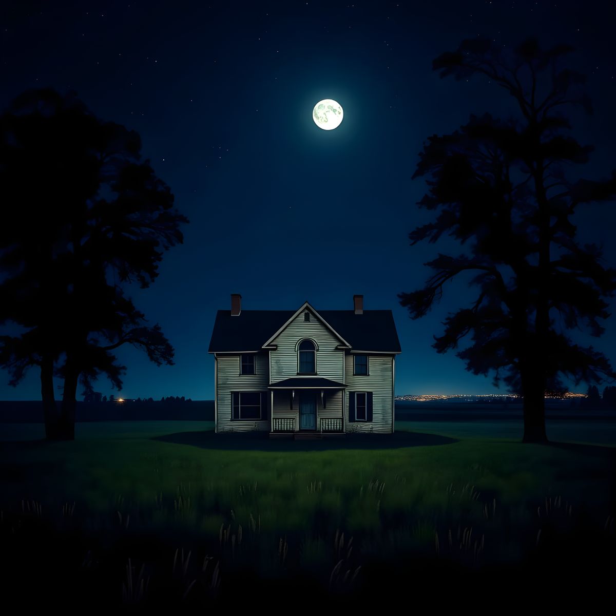 A serene and mysterious image of a weathered house at night, surrounded by dark trees and a deep green field, with a distant city glow on the horizon, evoking a sense of isolation and quiet contemplation.