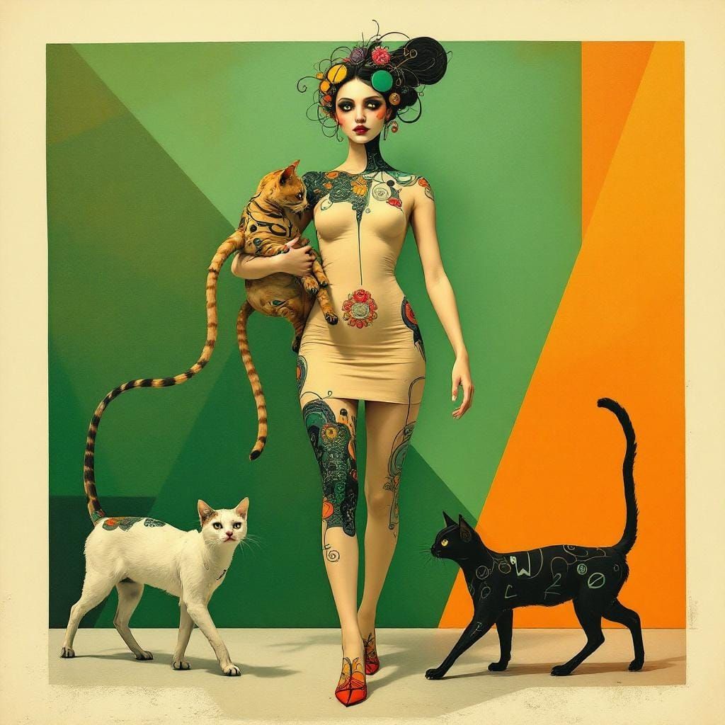 This image shows a stylized figure in a patterned dress holding a humanoid cat, with another cat walking beside them. The scene features a bold geometric backdrop, all rendered with surrealist and art nouveau elements.