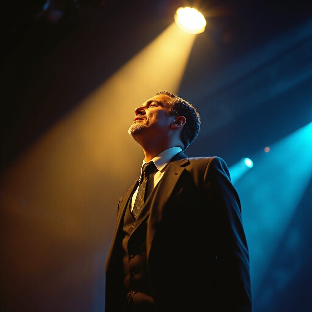 A poignant image of a man singing with passion on a dimly lit stage, surrounded by mist and a single spotlight, evoking a sense of drama and intensity reminiscent of classic cinematic masterpieces with a rich film grain aesthetic.