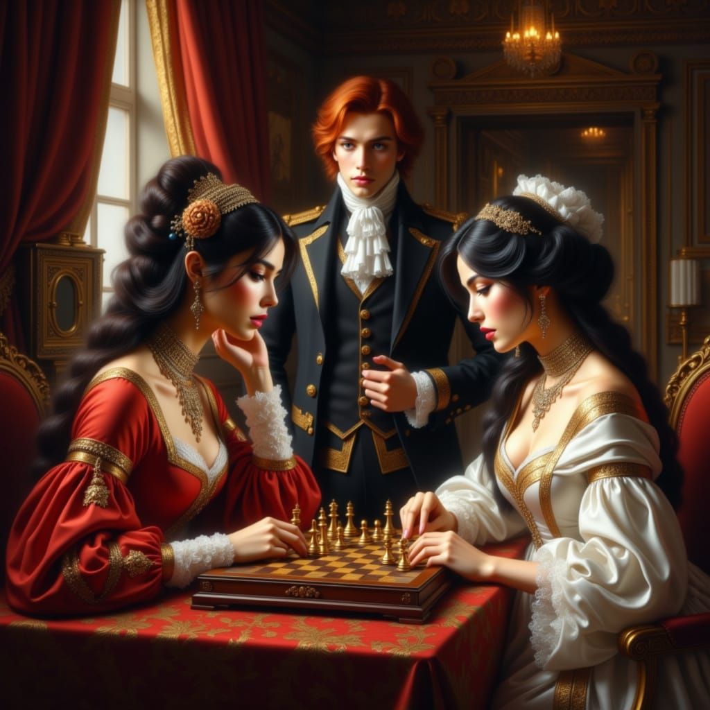 A digital painting depicts Tsarina Eudoxia in traditional Russian attire playing chess with Empress Catherine in a white gown. Tsar Peter the Great observes the game in a richly detailed 1718 setting, rendered with dramatic lighting.