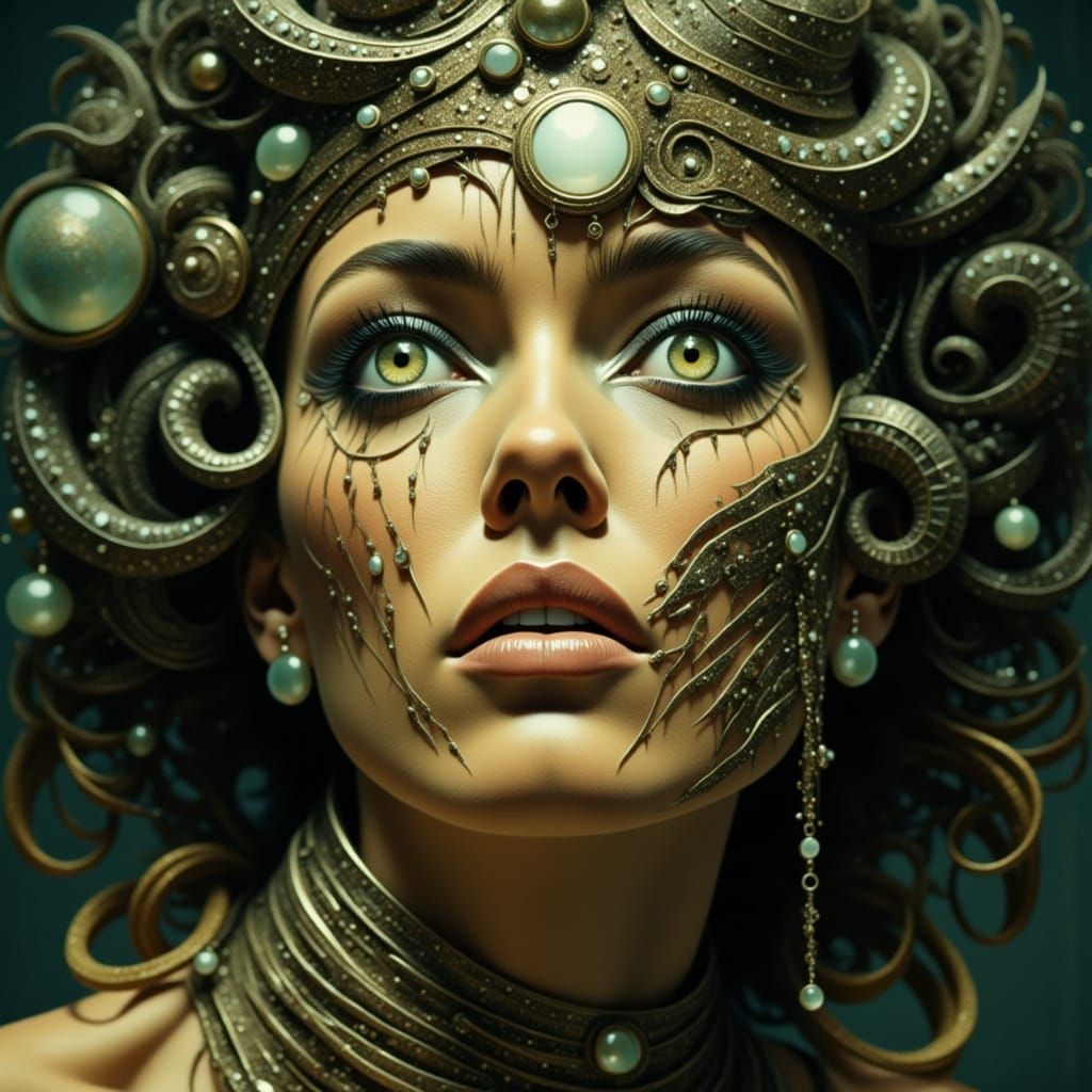 This image shows a close-up portrait of a woman's face, distorted in a mixture of fear and anguish, with a subtle sheen of sweat and eerie atmospheric lighting, blending biomechanical and surrealist elements.