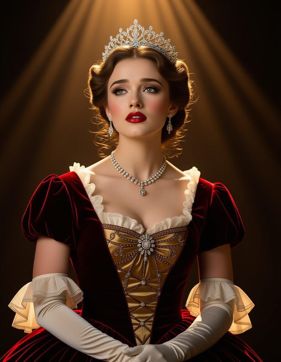 This photorealistic image captures a stunning opera singer in a vintage gown and tiara, illuminated by dramatic stage lights. The scene evokes profound emotion and grace with rich, deep tones.