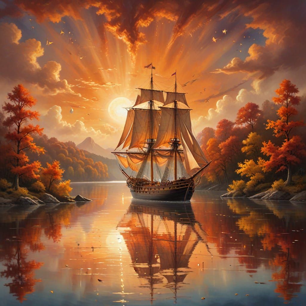 This image shows a tall ship sailing on a lake, set against a surreal landscape with autumn trees. Golden light and warm sunset colors create a dreamlike, mystical scene in an oil painting style.