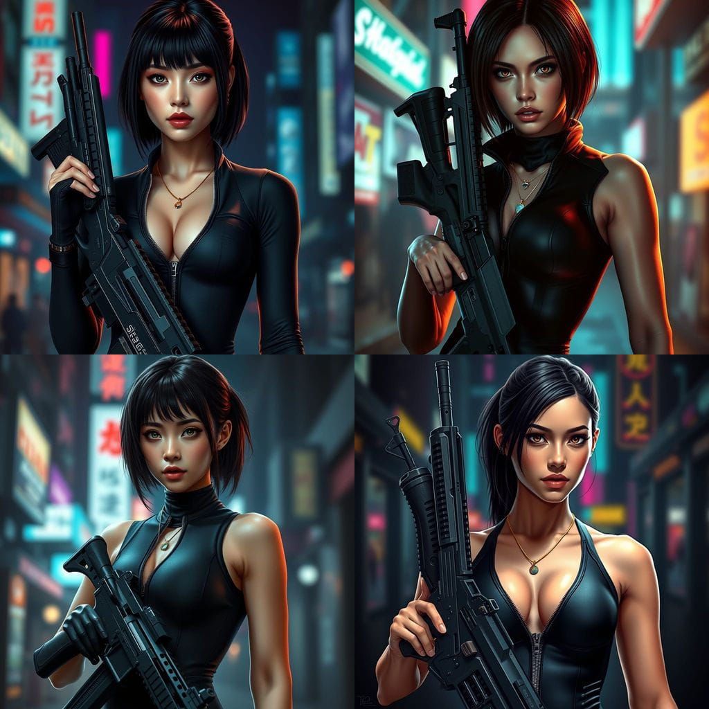 This image shows a realistic depiction of a woman in a cyberpunk aesthetic. She wears a black bodysuit and holds a rifle, set against a backdrop of neon city lights.