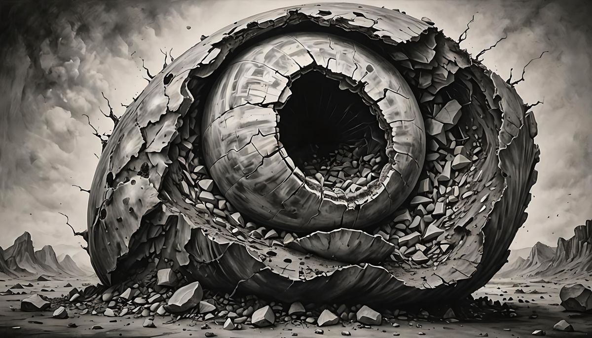 ‘Earth is fragile enough, yet we keep on cracking its shell until all that’s left is fragments and dust’, black and white charcoal drawing with strong greys, extremely high detail, soft but perfect line work, unsettling, trending at Artstation.
