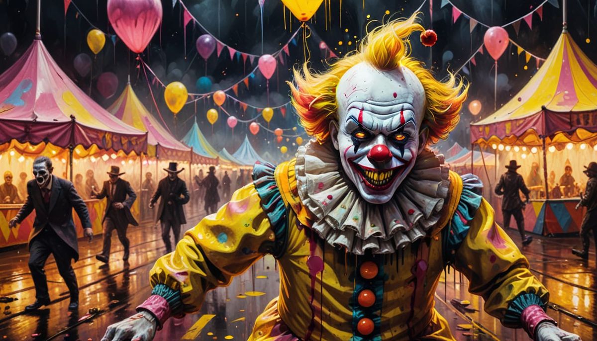 A striking picture of a sinister clown operating a bizarre game at a ghostly carnival. This pop surrealism piece uses bright yellow and pink colors, ink splatter effects and high contrast lighting to create an eerie atmosphere.