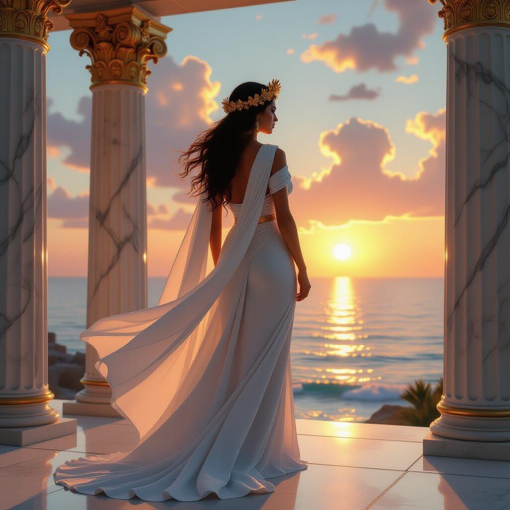 This image shows a Greek goddess in a temple at sunset. She wears flowing white robes and a golden laurel wreath, rendered with dramatic lighting and intricate details in a hyperrealistic style.