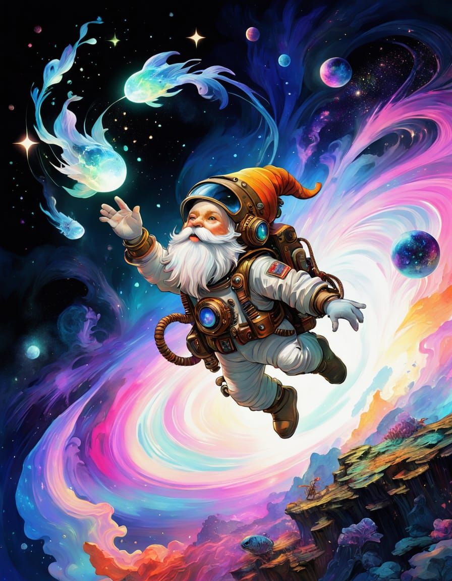This cosmic fantasy illustration depicts a gnome astronaut in a detailed steampunk suit exploring a nebula. Ethereal, energy-based fish-like creatures swim around him, rendered in a watercolor and ink style with vivid, high-contrast lighting.