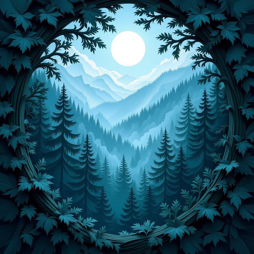 This image showcases intricate wood carvings depicting the Black Forest. Dark green wood shavings form trees under a blue sky, with white and silver mist adding ethereal realism in a 3D rendered style.