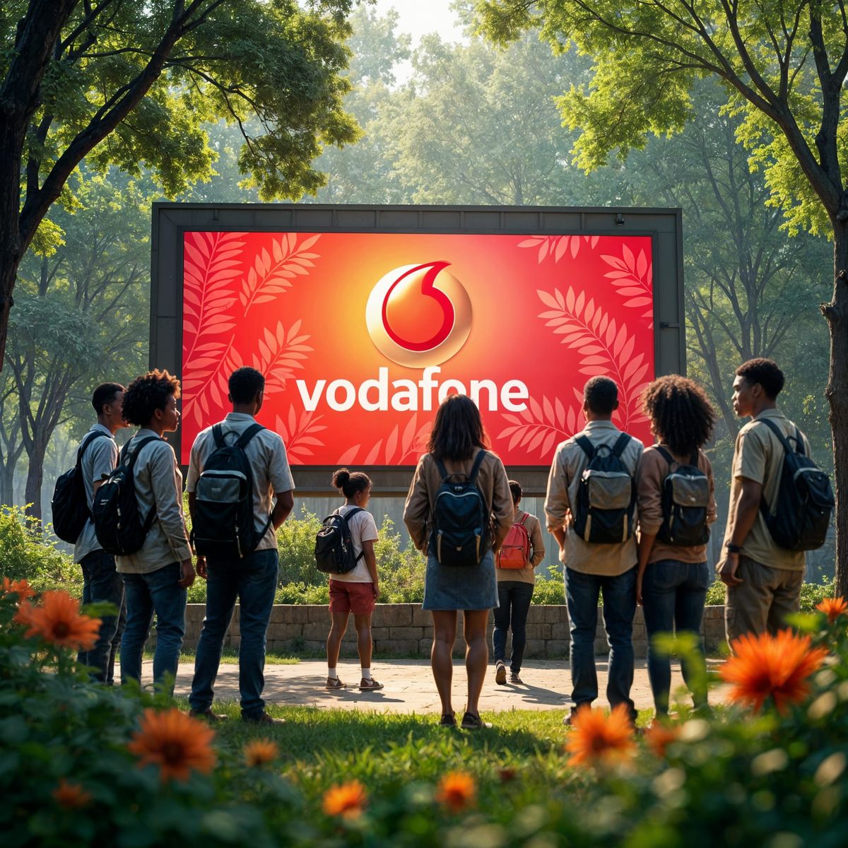 This image shows African American students in a university garden watching a Vodafone advertisement on a digital billboard. The scene is a detailed matte painting with deep, complementary colors.