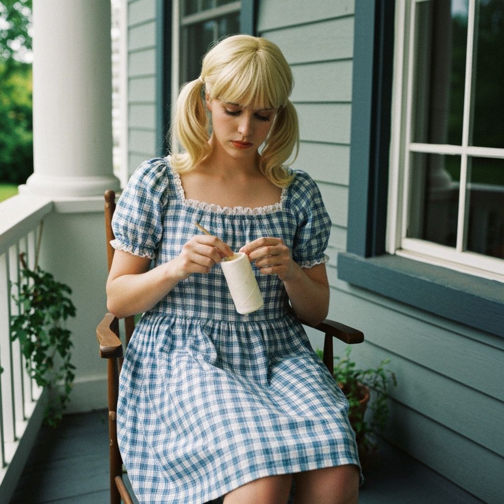 Cinematic film still of a young man in a plaid babydoll dress and blonde wig, sitting on a porch chair and embroidering. Shot with film grain and dramatic lighting.