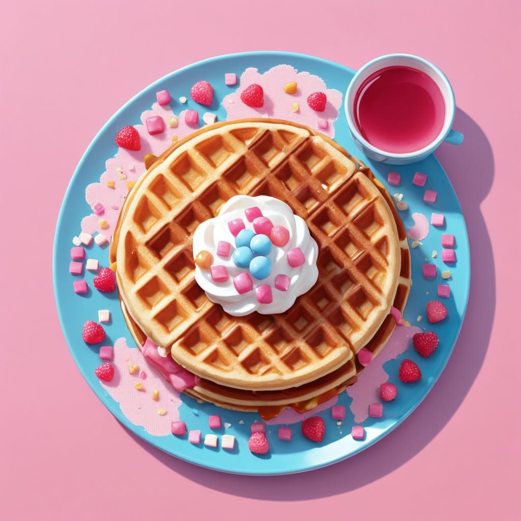 Pixel art. Medium shot. A delicious square waffle on a pastel pink plate. Overhead shot. Vibrant colors and chunky pixels. Glowing syrup drips from the waffle's edges. Sparkling sugar sprinkles on top. A subtle gradient of blue and white in the background. Warm and cozy lighting. Pixel perfect, 8-bit ...