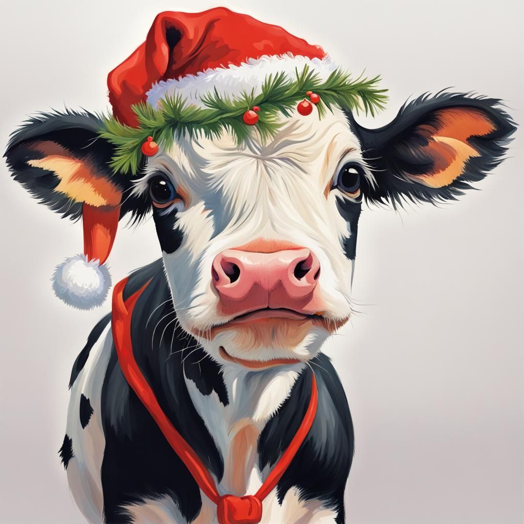This image shows a cute baby cow wearing a Christmas hat. The artwork is a gouache painting with fine details.