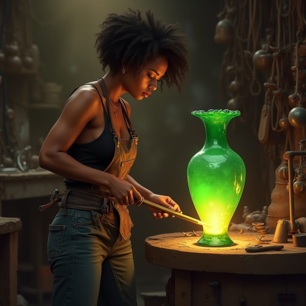 A photorealistic portrait of an African American woman intensely blowing glass in a cluttered studio, surrounded by wooden workbenches and metal tools, with a vibrant green vase taking shape.