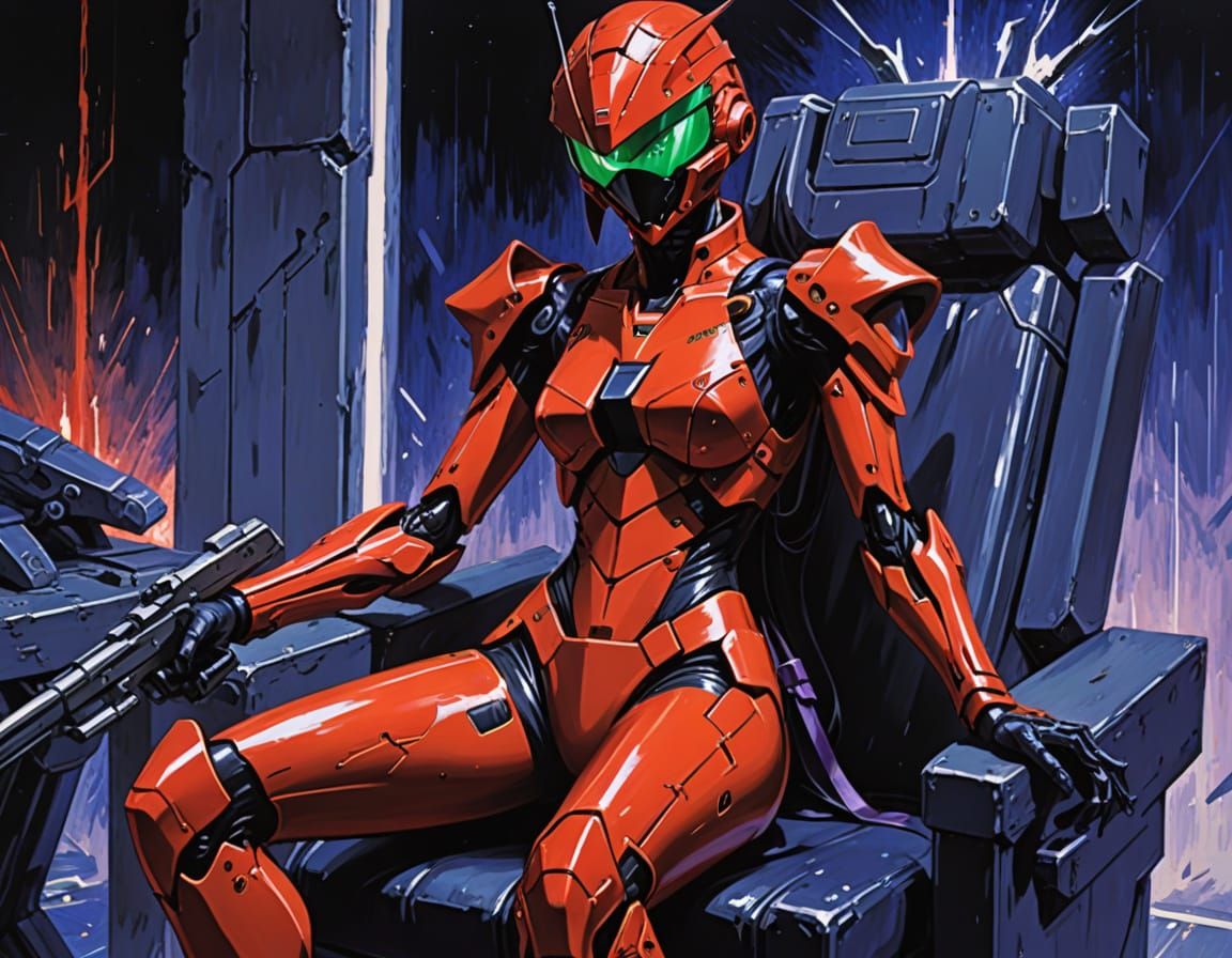 A beautiful, painterly portrait of a female warrior from the Neon Genesis Evangelion universe, sitting on a throne with a lance and exuding an air of quiet confidence.