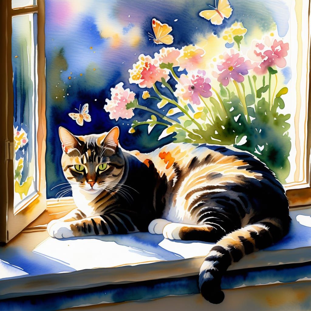 A watercolor painting depicts a tabby cat on a windowsill, observing a garden. The impressionistic artwork uses soft brushstrokes and a pastel palette to create a dreamy, serene atmosphere.