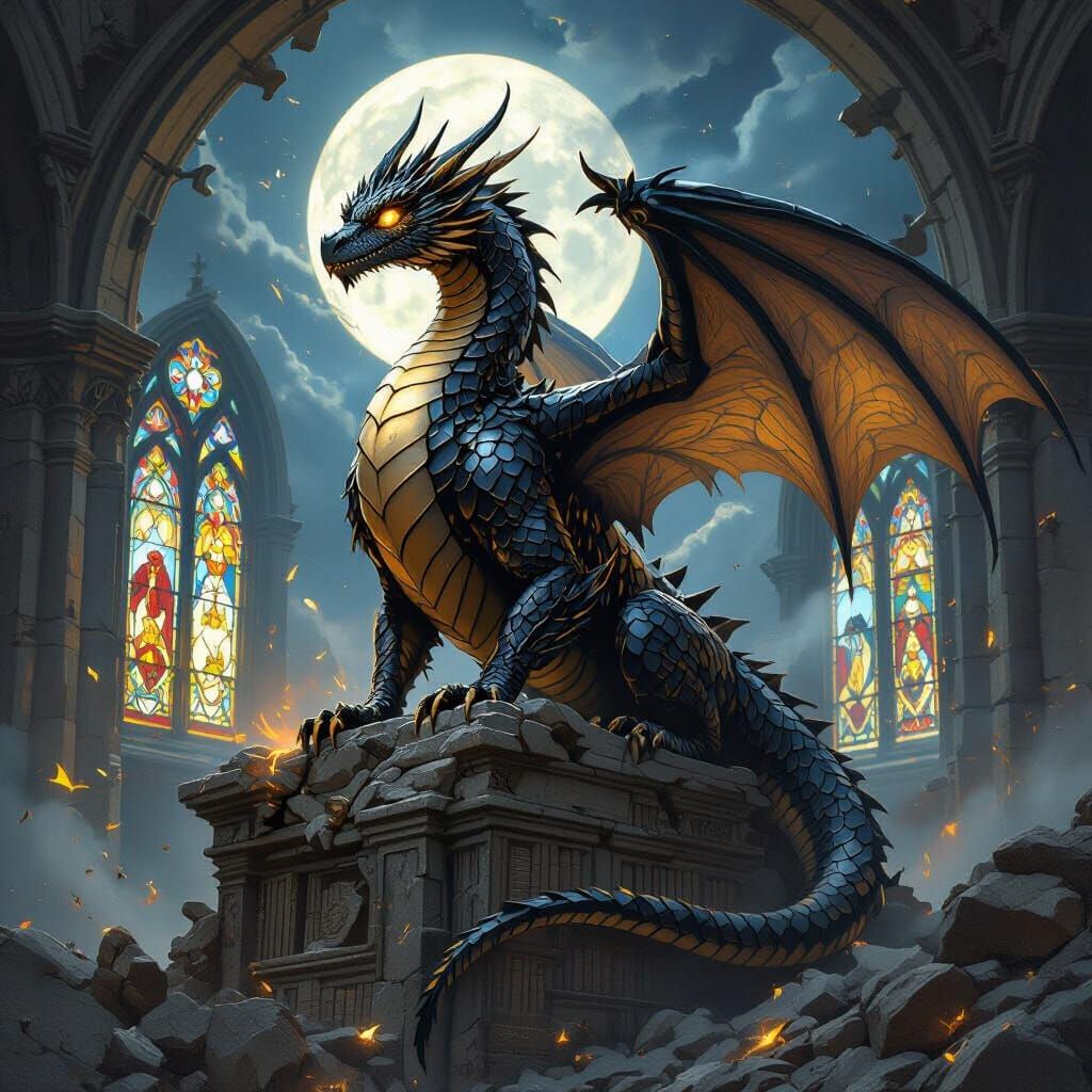 This image shows a hyperdetailed dark fantasy dragon with obsidian scales and molten gold eyes. The dragon is perched on an ancient, crumbling library beneath a dramatic moonlit sky, as digital art.