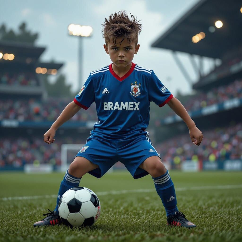 This image shows a punk rock-style cartoon mascot of a tough-looking boy in a royal blue soccer uniform. The artwork features cinematic textures and dramatic lighting in a dark, deep color palette.