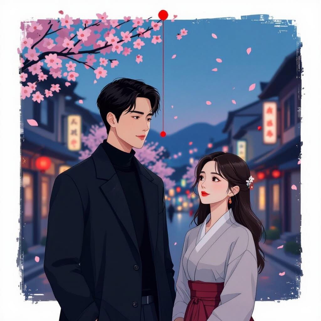 A cinematic portrayal of a Korean couple connected by fate on a dreamy city street at twilight. Features soft pastel tones and striking red accents.