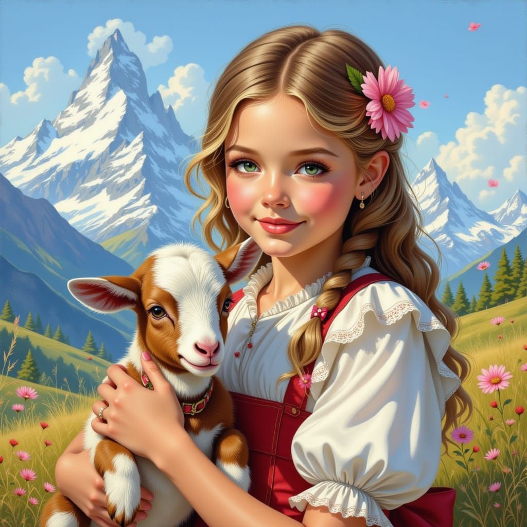 This oil painting features a close-up portrait of a young girl in traditional Swiss attire, holding a gentle goat. The Matterhorn mountain rises majestically behind them under a blue sky. Rendered with impasto brushstrokes.