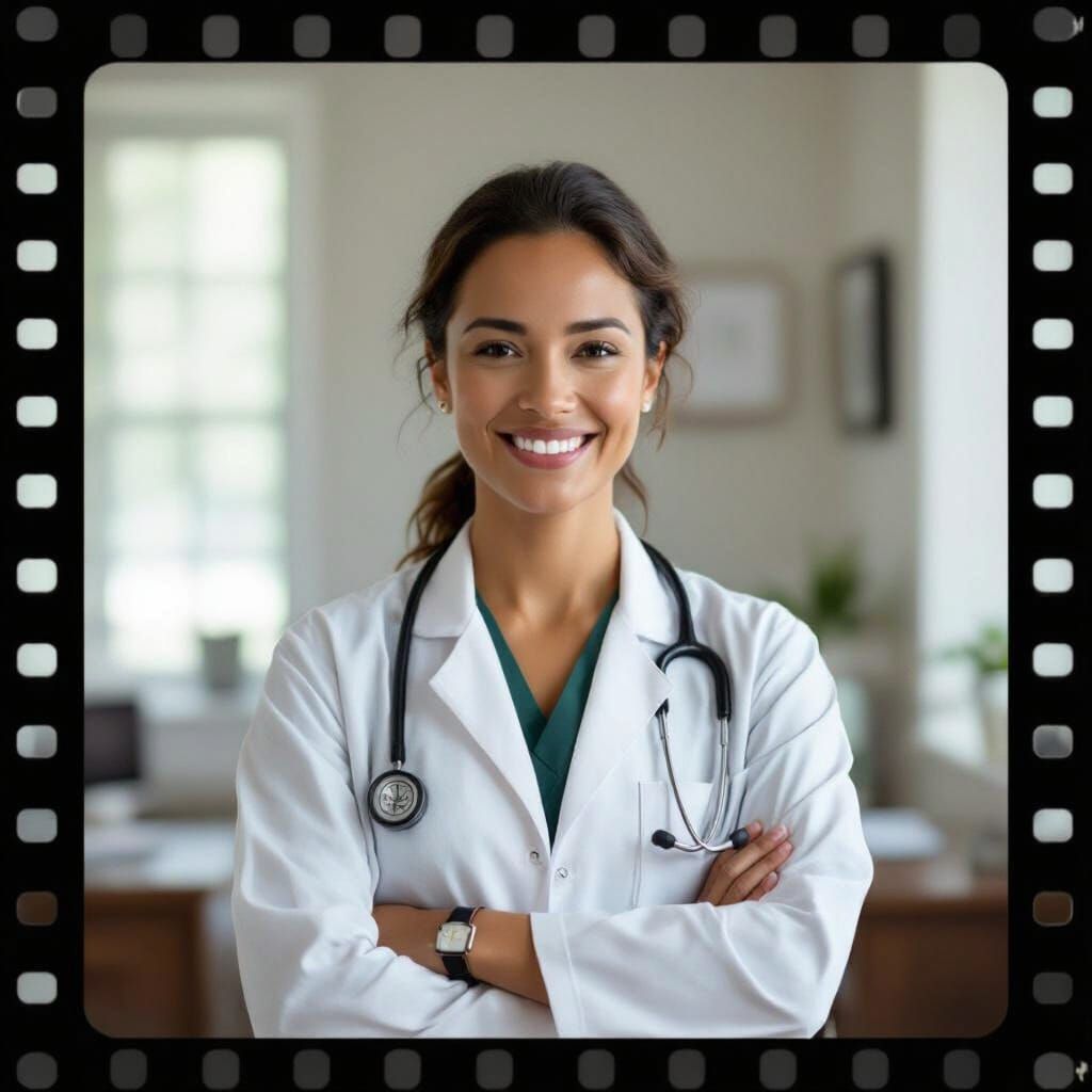 This image shows a Black female doctor in a naturally lit office. She is wearing a white coat and holding a stethoscope. The scene is captured with film grain and cinematic coloring.