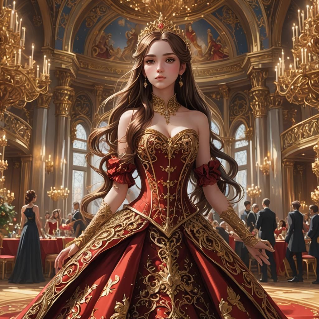 This image shows a 14-year-old girl with long brown hair in an ornate red and gold corset dress. The 3D anime art, inspired by WLOP, features silver gloves, a golden tiara, and an elegant ballroom setting.