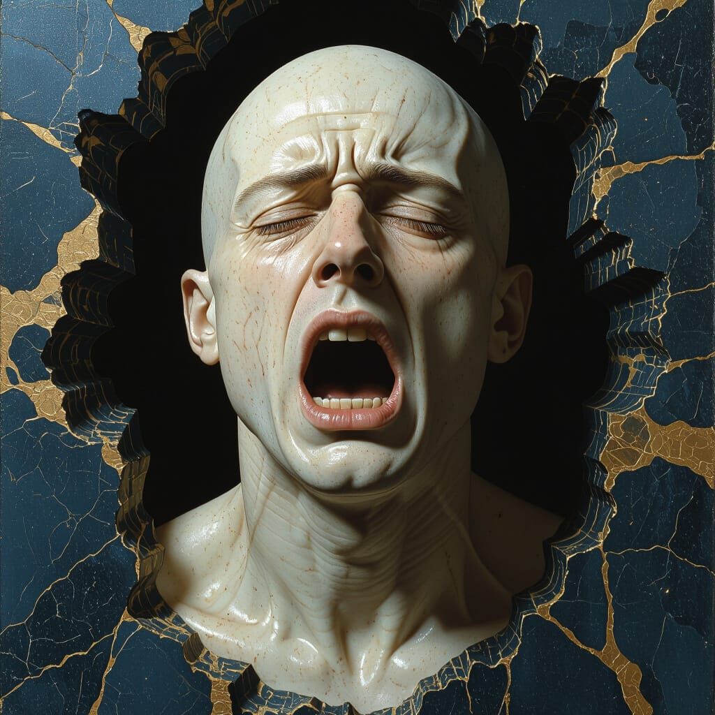 This image shows a bald young man sculpted in the style of ancient Greek marble statues. The man's face is contorted in agony, set against a dark, ambiguous backdrop with a rich, matte painted aesthetic.