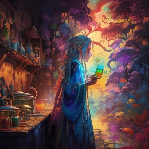 This whimsical illustration shows children measuring and mixing vibrant, glowing liquids in an enchanted wizard's workshop. Features include bubbling cauldrons and scattered mystical ingredients.